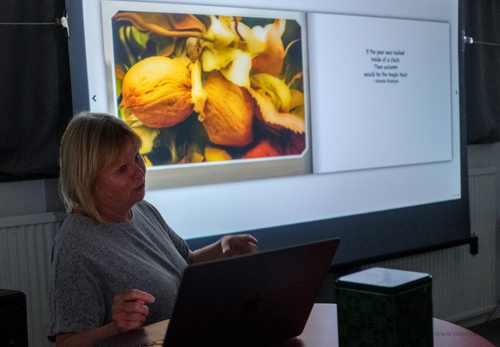 Marie-Louise Hansson, hon berättar att gruppen har gett henne mycket inspiration och nya idéer. Resultatet blev en fotobok på temat hösten med citat till varje bild, som vi fick se bilder från. Hon är i gång med en ny bok om årstiderna.