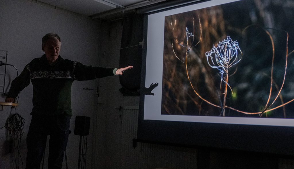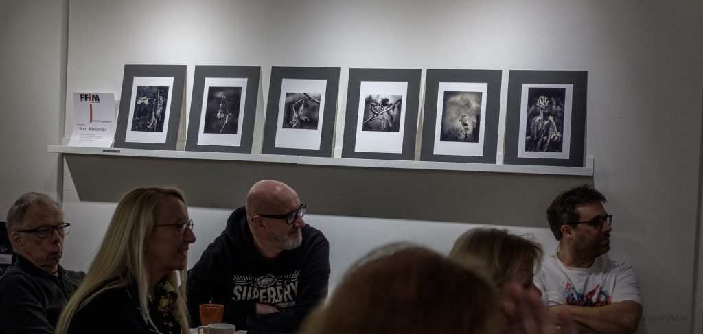 Sven Karlander: Pratade om förgänglighetens estetik och skönheten i det som vissnat ner. Hans projekt börjad med en tanke att fota blommande och prunkande Dahlior. Men efter diskussioner och tips i gruppen kom projektet att handla skönheten hos vissna blommor och dess former, i form av svart/vita bilder.
