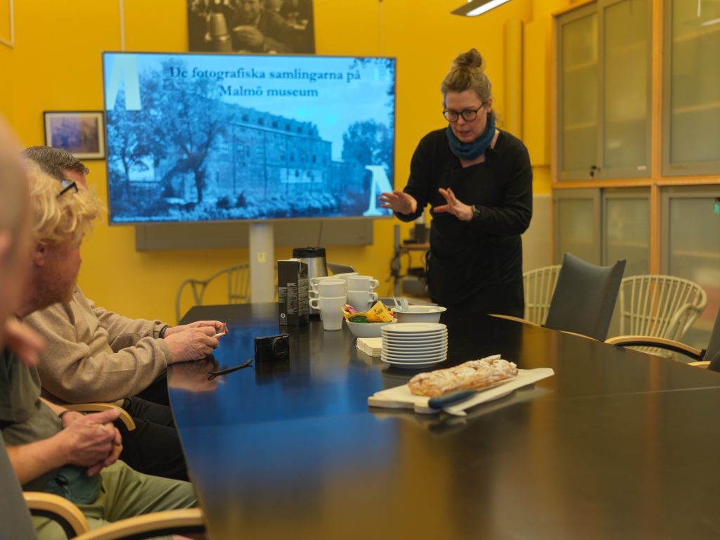 Efter snabb inpassering genom grindar och hissar för att inte utlösa skalskyddslarmet till Foto arkivet, befann vi oss i ett bekvämt konferensrum där våra värdar Lina Åhlenius och Ulrika af Wetterstedt hälsade oss välkomna med fika. Lina och Ulrika är ansvariga för FDM50-projektetet. Lina är intendent och fotokonservator på Malmö Museum, Ulrika är arkivarie på museet.