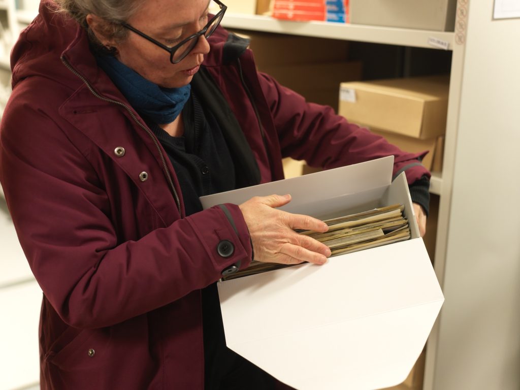 I arkivet finns också Georg Oddners omfattande material, här ser vi Lind med en box som innehåller negativ och positiva bilder tillsammans med diverse anteckningar som Oddner gjorde i samband med att bilderna togs.