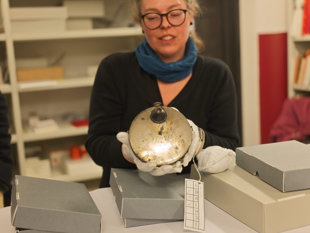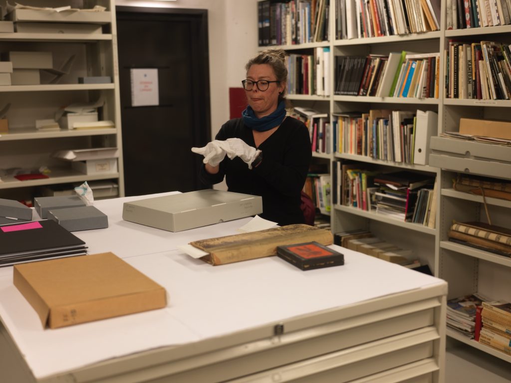 Efter att ha betrakta ett antal olika tekniker var det dags att gå in i det klimatanpassade arkivet, vilket skedde genom en sluss. Material som skall in eller ut ur arkivet placeras under 24 timmar i slussen för att gradvis anpassas till temperaturen i det mottagande rummet.