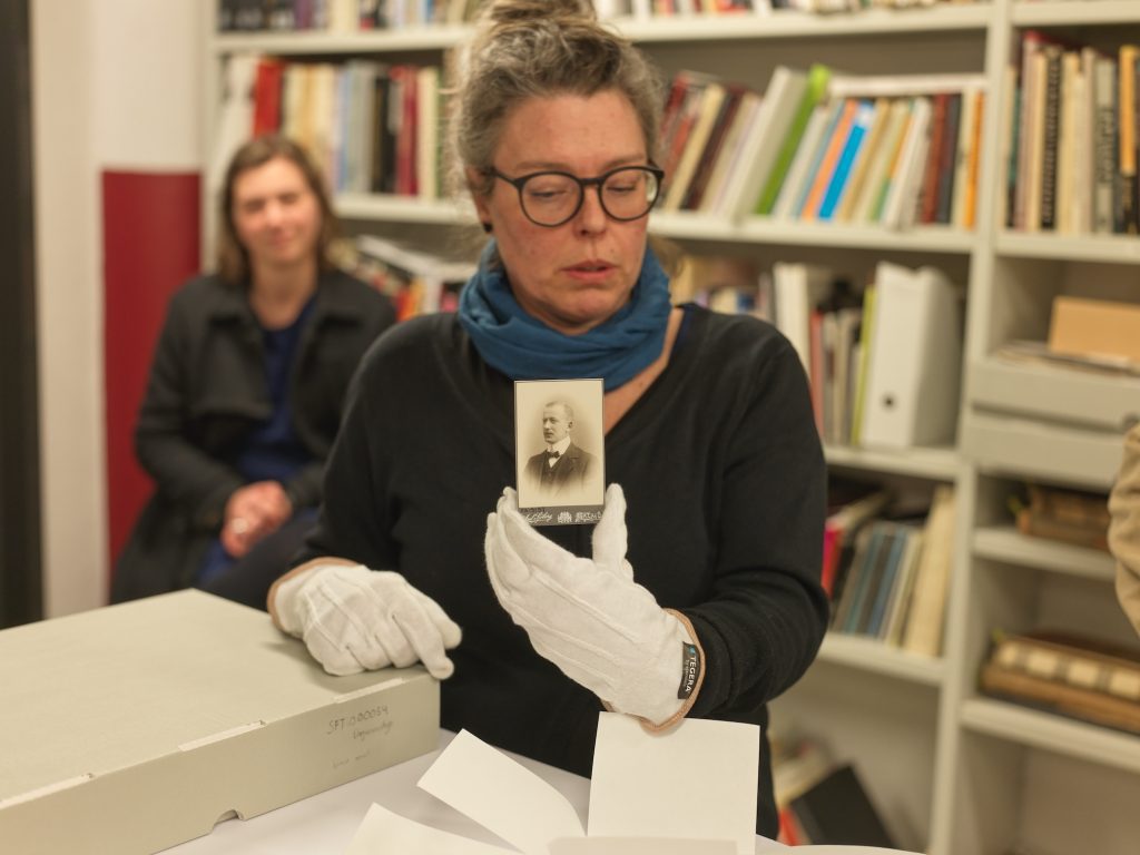 Efter bildvisning på skärm var det så dags att gå och kolla på det fysiska materialet i arkivet. Efter hissåkning och passage genom diverse korridorer kom vi fram till visningsrummet där Lina visade ett antal gamla och intressanta bilder, men först efter att Lina hade iklätt sig korrekt klädsel, vita luddfria handskar, för att hantera det gamla materialet.