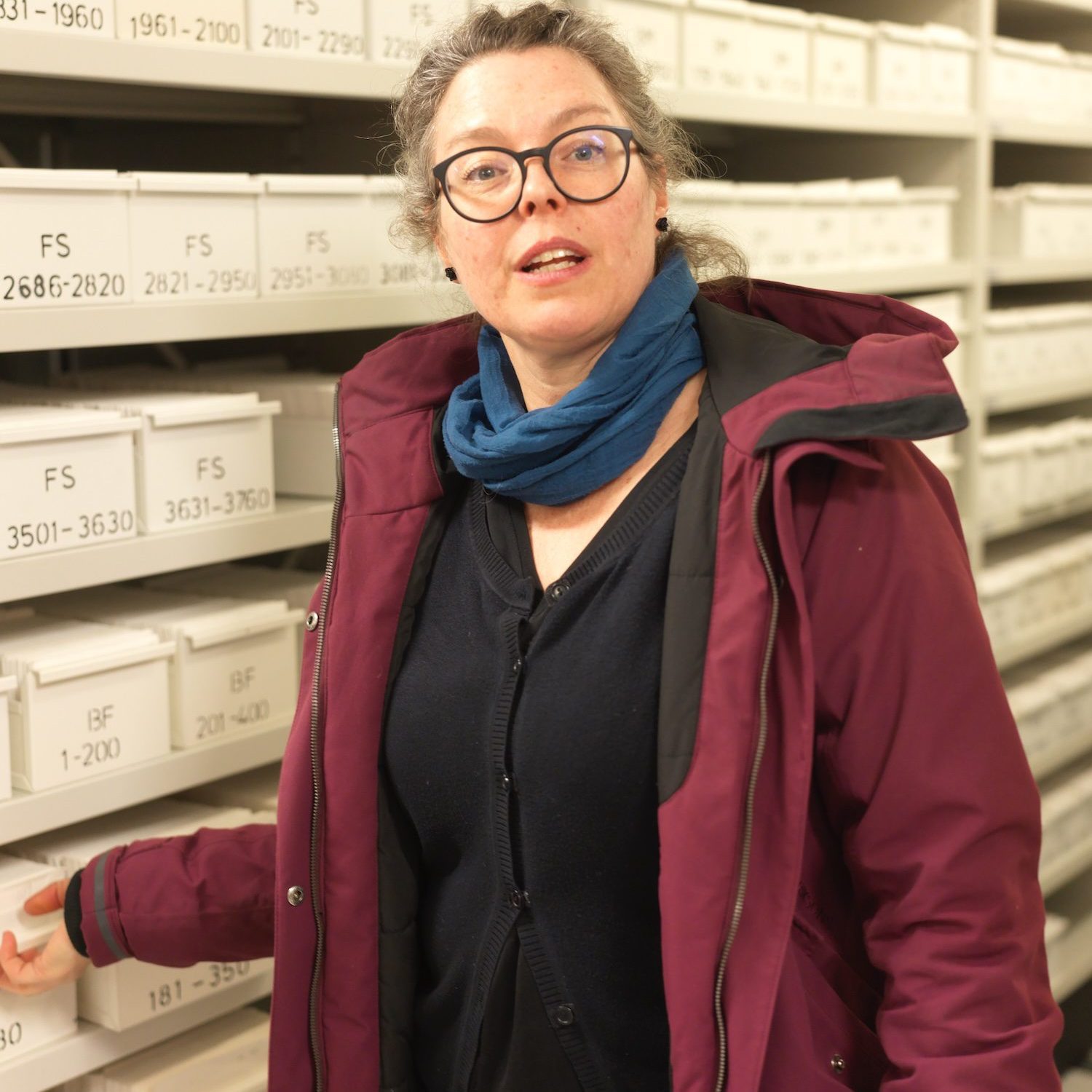 I arkivet finns ett antal förvaringshyllor, manuellt manövrerade, för att kunna utnyttja utrymmet maximalt. Här fick vi se samlingen av glasplåtar. Dessa förvaras i backar med en total vikt av 15-20 kilo.