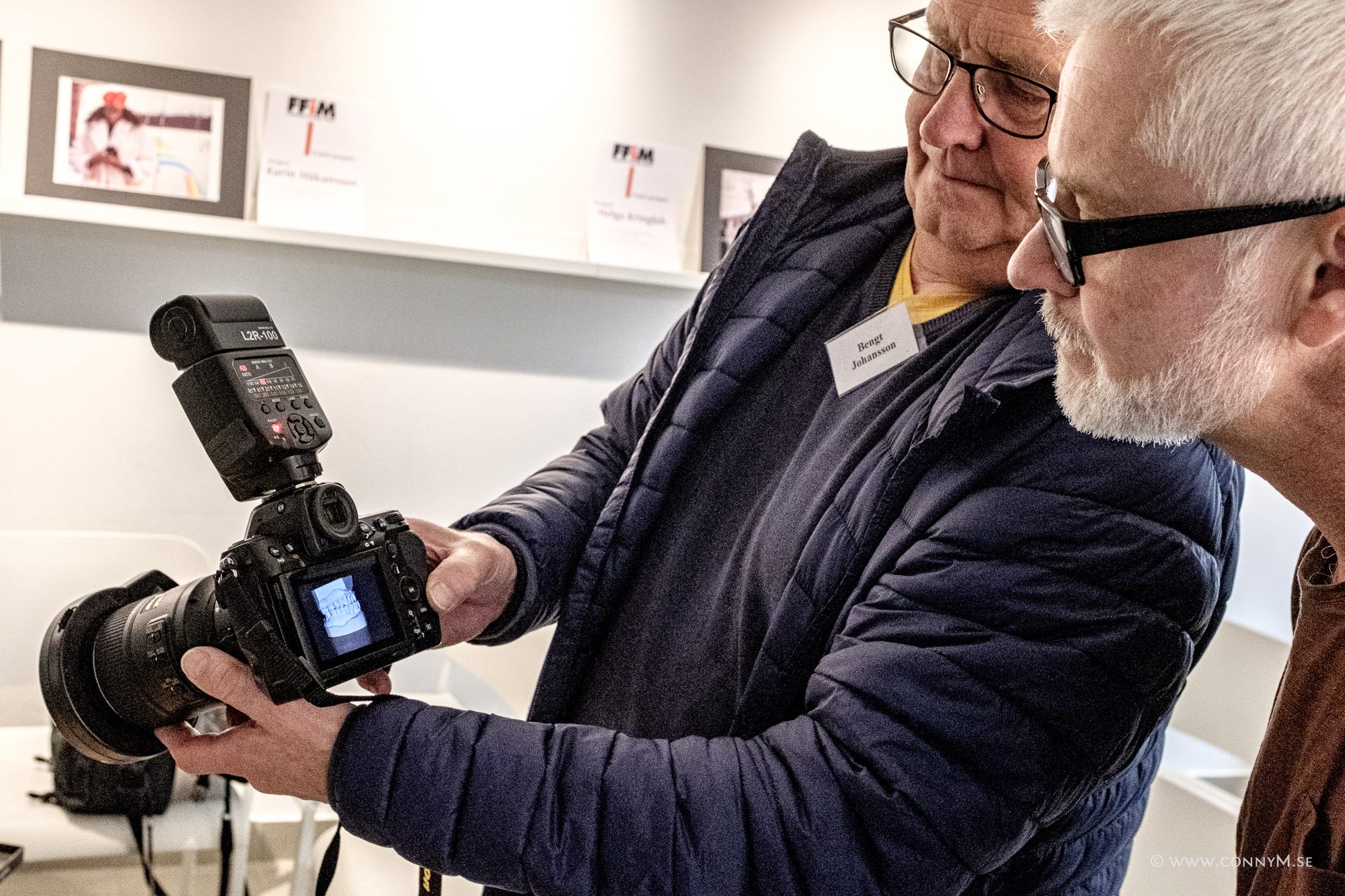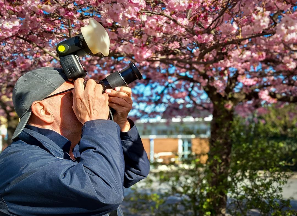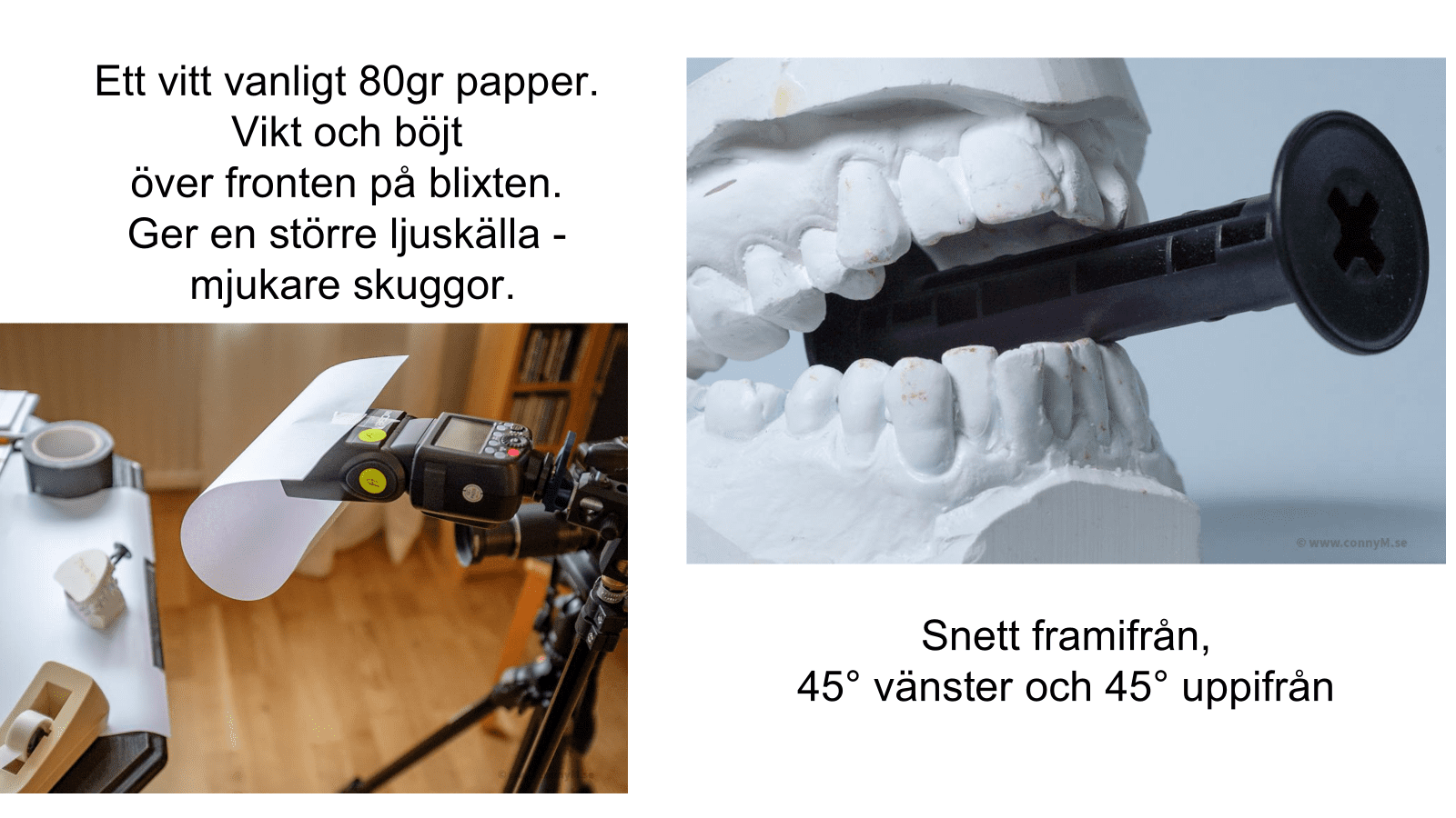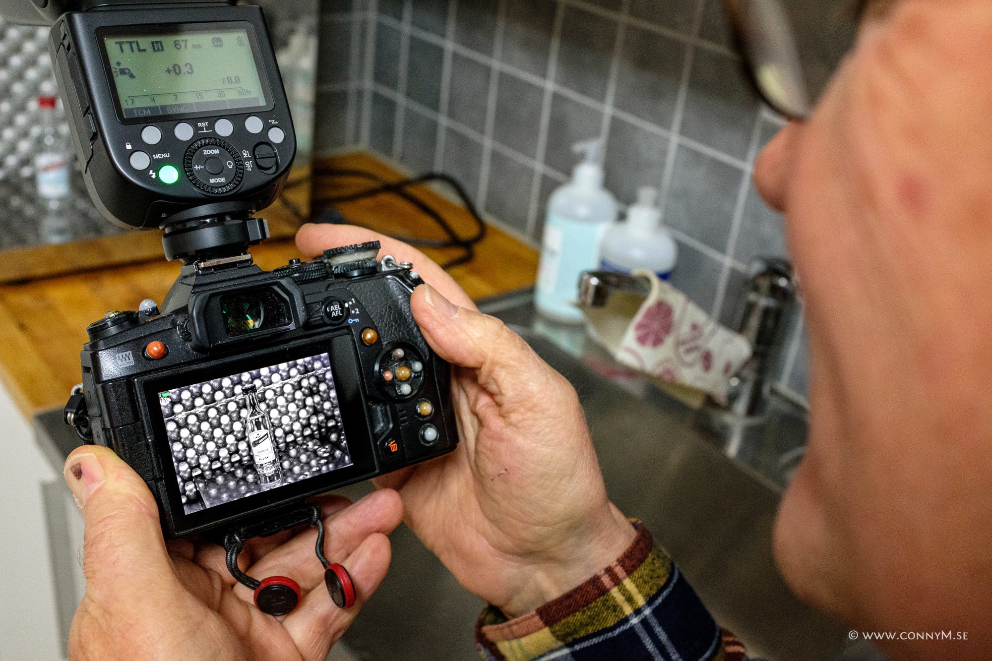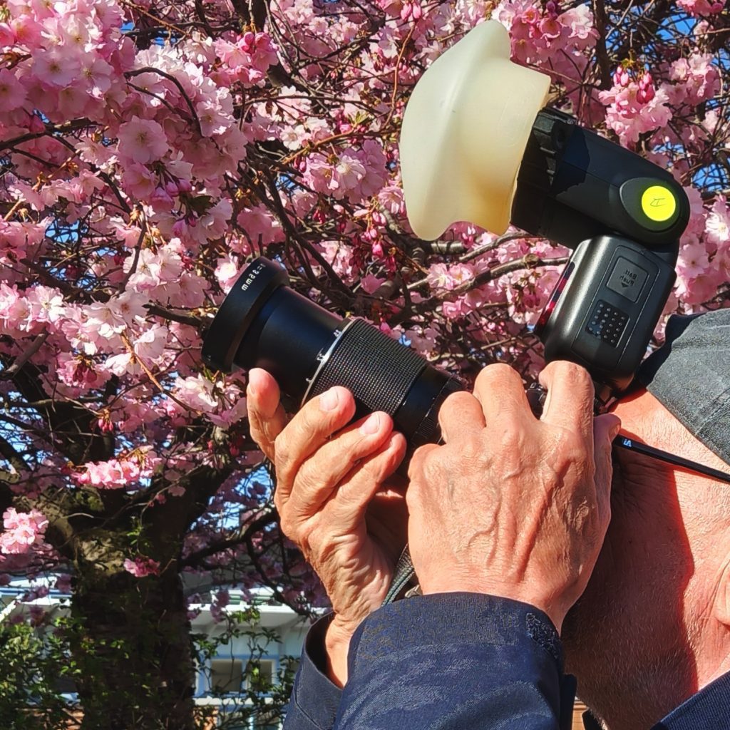 Man trär ”skärmen” över objektivet och har blixten på kameran. Bengt har satt sin blixt inte direkt på kameran, utan på ett tillbehör, strax till höger om kameran. Detta för att få ett lite mer sidoljus.