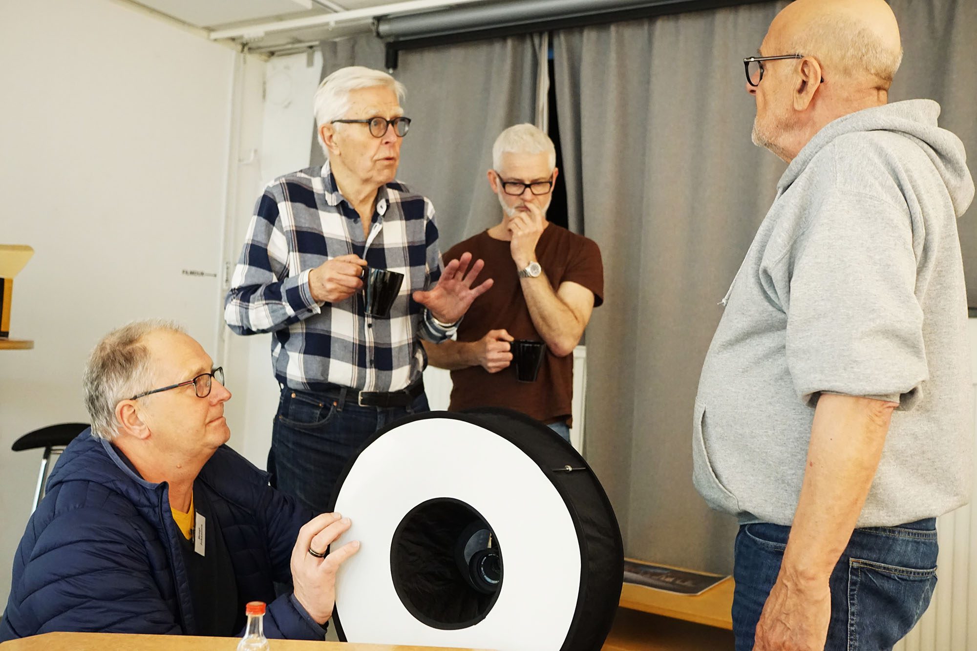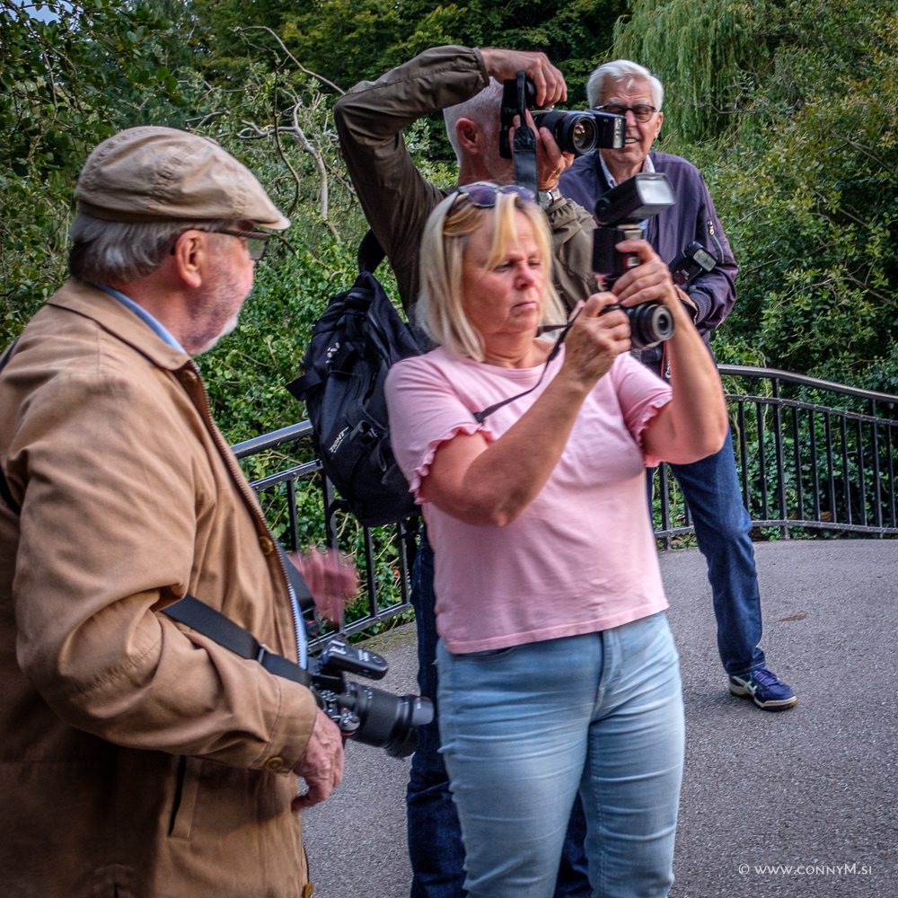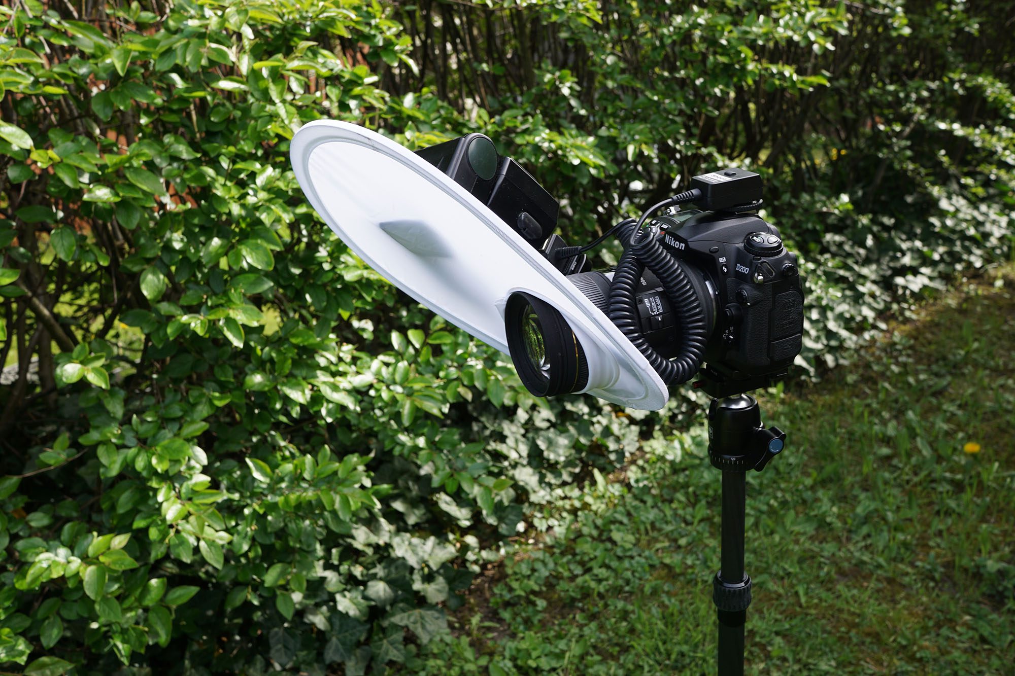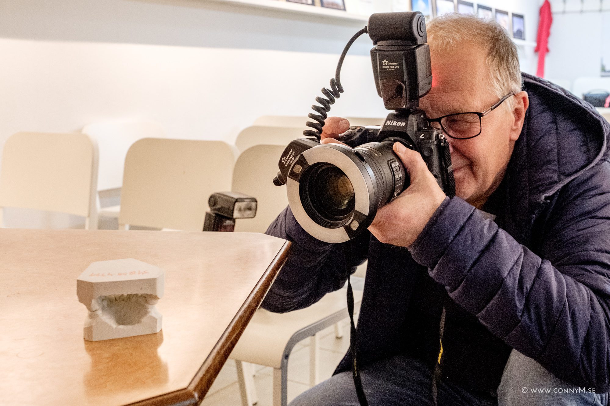Man trär ”skärmen” över objektivet och har blixten på kameran. Bengt har satt sin blixt inte direkt på kameran, utan på ett tillbehör, strax till höger om kameran. Detta för att få ett lite mer sidoljus.