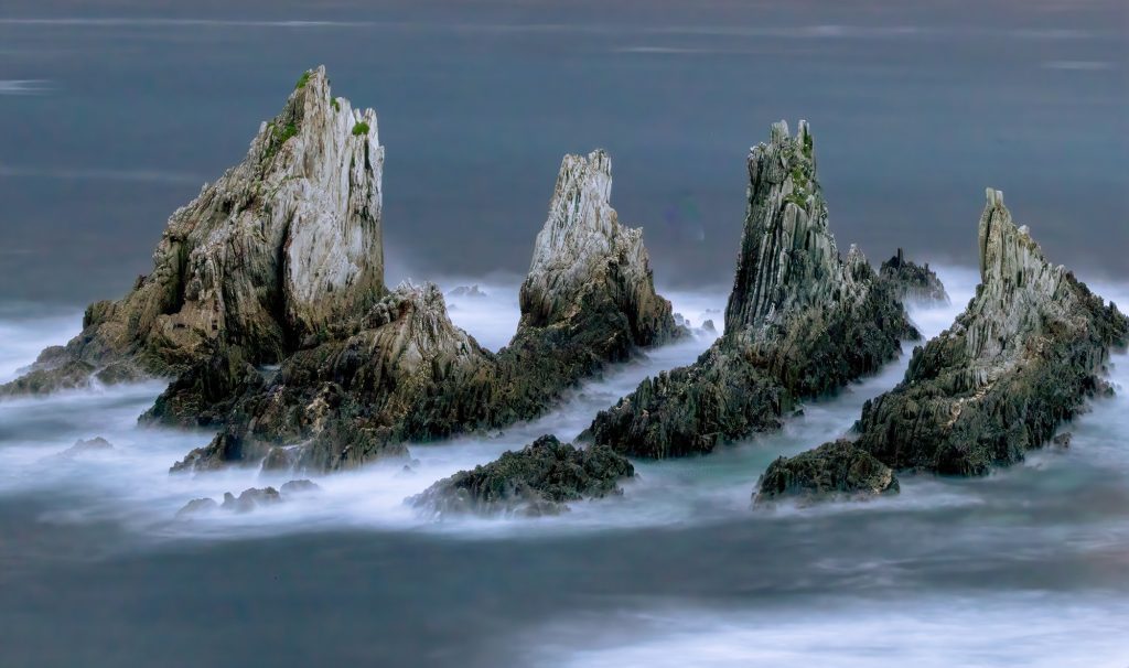 Vidare fick vi se fantastiska miljöer skapade av tidvatten och vågor, fiskesamhälle med färgrika hus, Guggenheim-muséet i Bilbao, liten ö med kyrka längst upp och sist men inte minst ”hajfenorna” i Gueirua som var resans höjdpunkt. Dessa stack upp hela 50 meter över vattenytan.