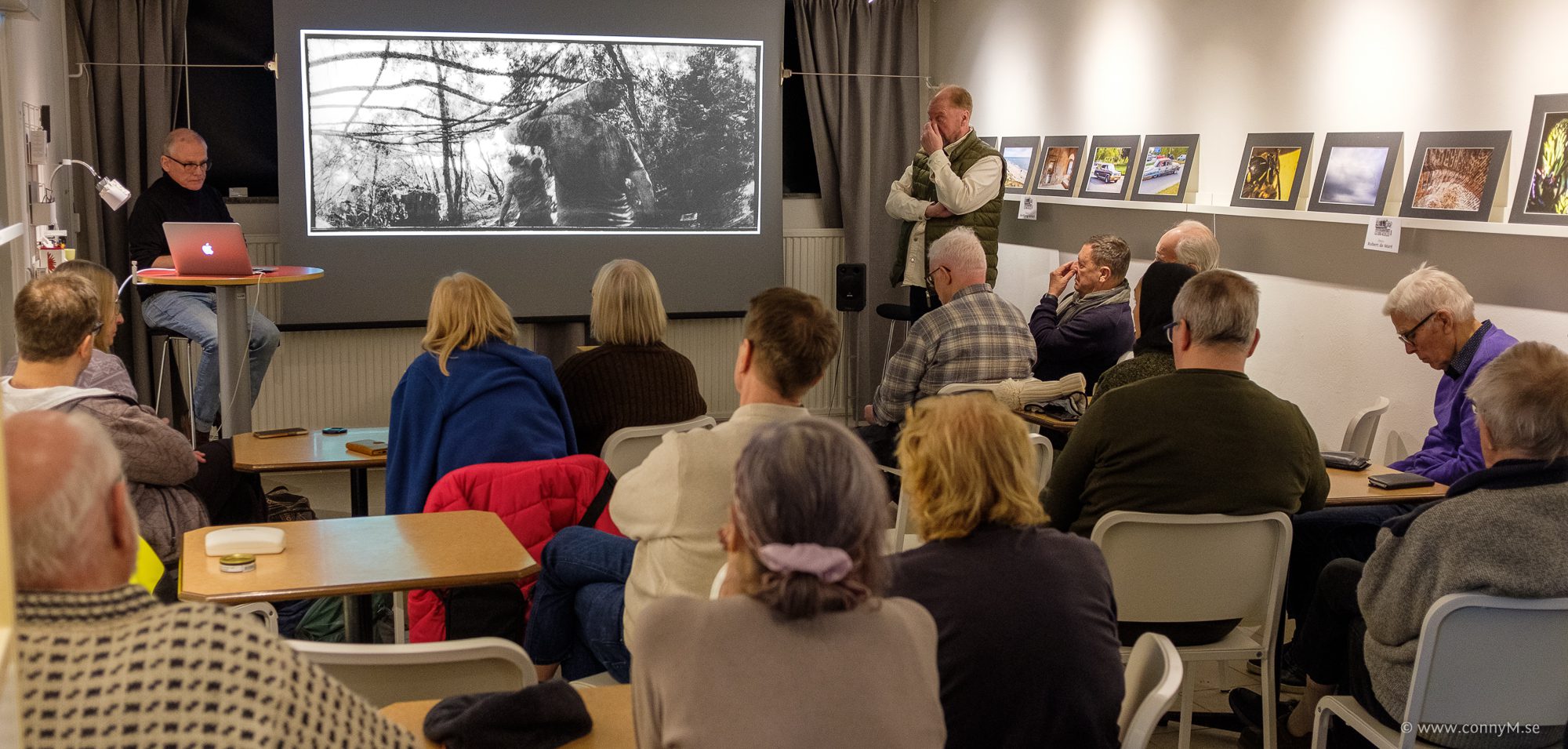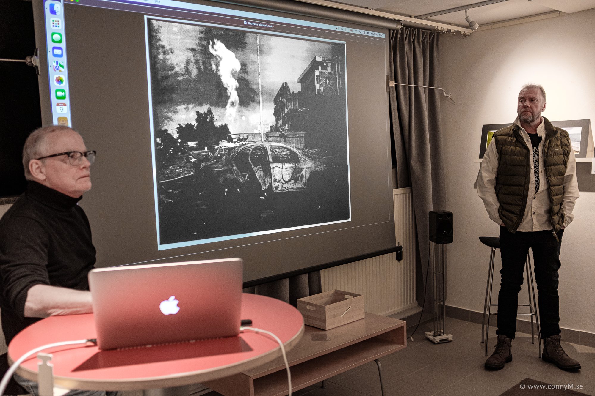 Fotograferna Örjan Kristenson och Håkan Karlsson från Galleri Direkt i Landskrona är på besök med anledning av att några ur föreningen besökte utställningen med Vladyslav Krasnoshchoks bilder i höstas och ville se och höra mer.