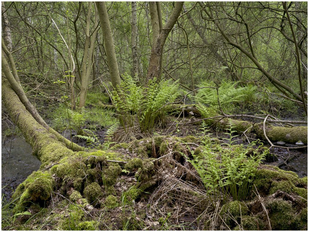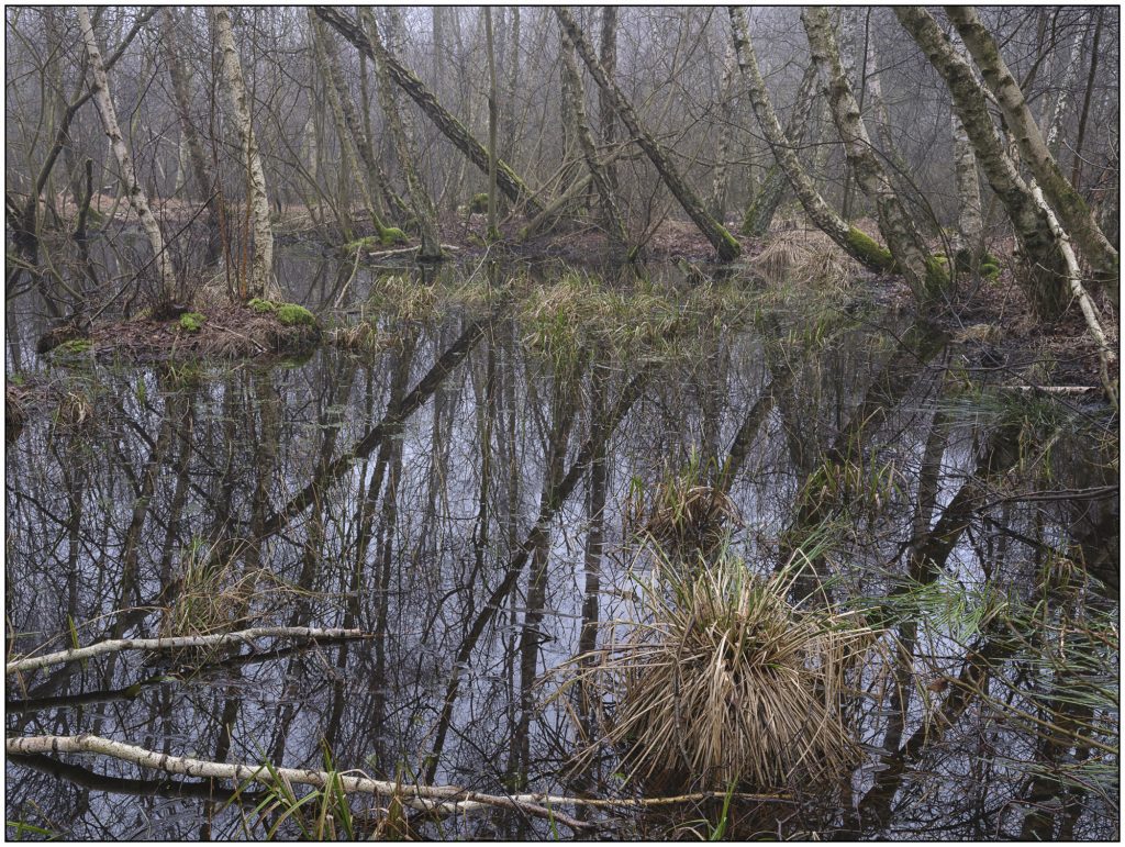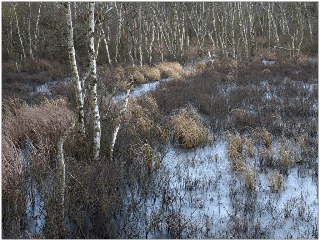 Många av de bilder som Mattias visade var tagna vid olika vattendrag och där drog han nytta av reflektioner i vattenytan för att leka med speglingar, inte minst av himlen…som därmed syntes, även om den var bortskuren högst upp i bilden. Han visade även exempel på hur han genom att sammanfoga bilder kunde motverka vidvinkeleffekten med lutande trädstammar för att få allting att se rakt ut i skogen.