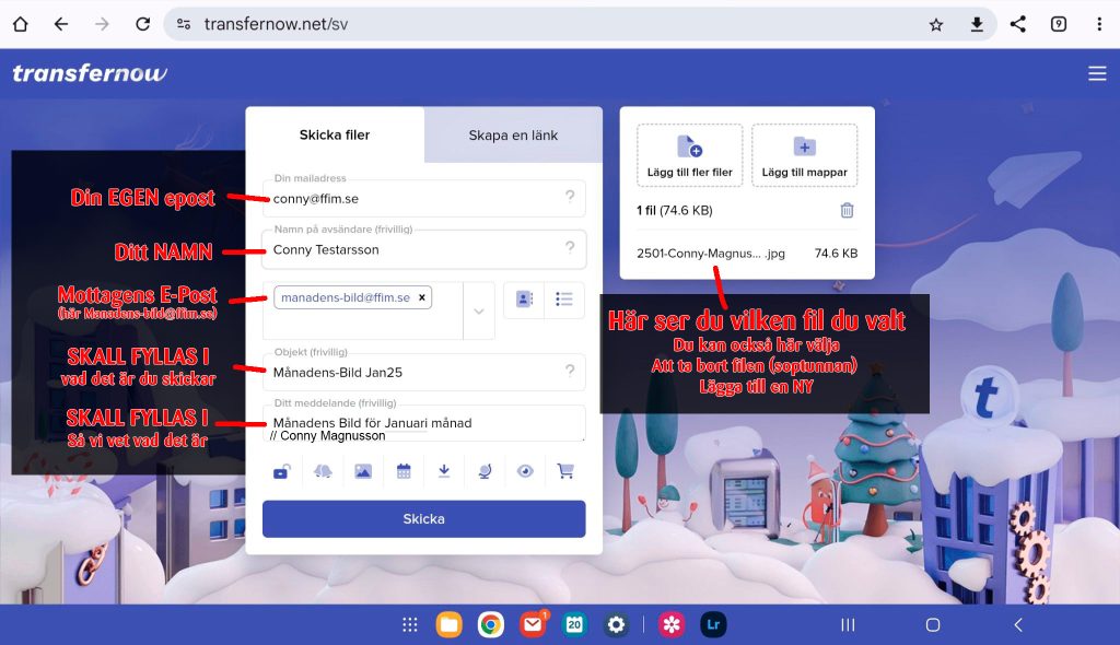 När du skall skicka bilder till t.ex Månadens Bild, är det enklast att använda www.transfernow.net!